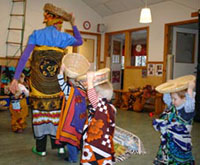 Maria har med kangas som alla får låna, dessutom får alla lära sig att bära korgar på huvudet och babydockor att ha på ryggen. Vi dansar afrikanska danser.